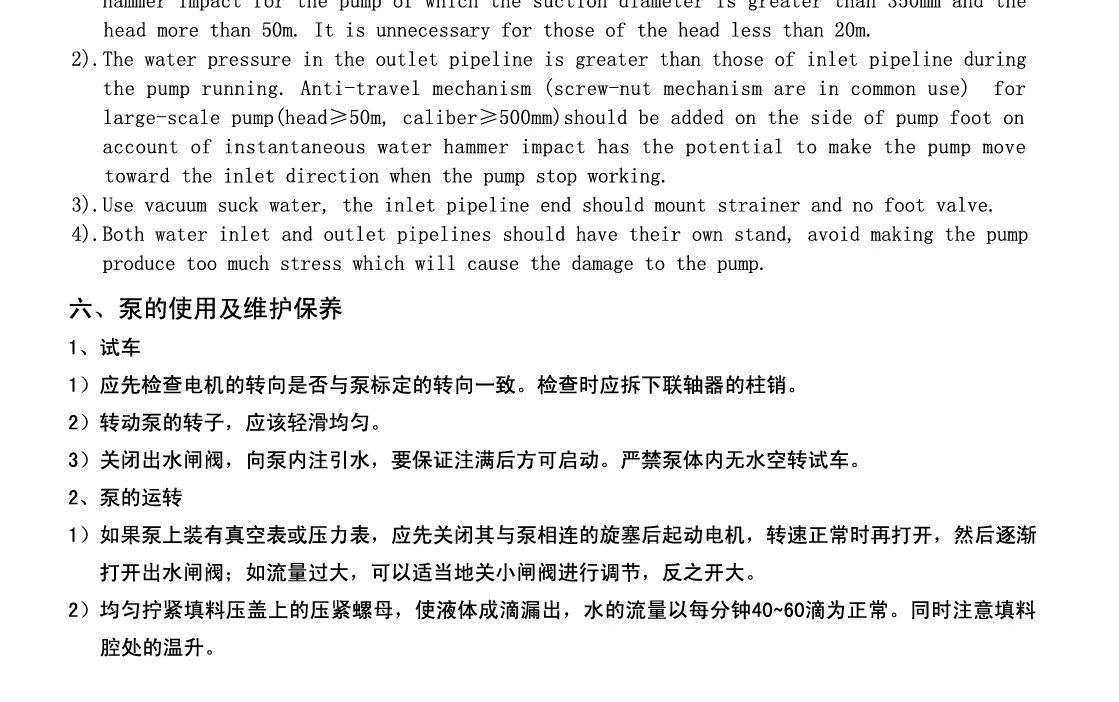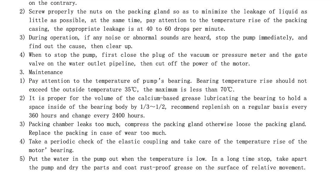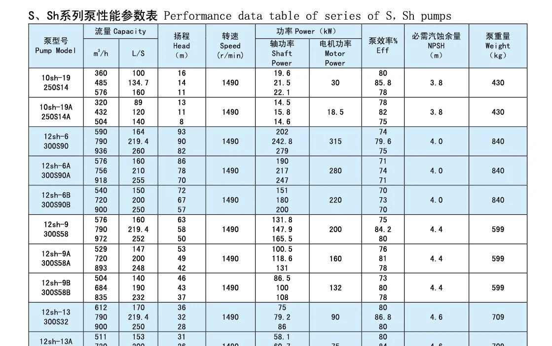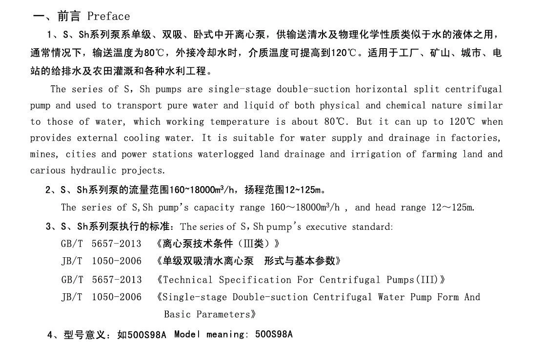Yanshan-tuotemerkki S, SH-pumppu on yksivaiheinen, kaksinkertainen imu, pumpun kuori vaakasuora avoin keskipakopumppu. Veden välittämiseen sekä veden kaltaiseen fysikaalisten ja kemiallisten ominaisuuksien välittämiseen keskilämpötila on 80 astetta C. Jos päätylaakeri on liitetty jäähdytysvedeen ja keskilämpötila on jopa 130 astetta C, juoksupyörän, tiivisteen ja akselitiivisteen materiaali voidaan vaihtaa ja sedimenttiä sisältävä mutainen vesi voidaan poistaa. Pumpun laakeri on yleensä pehmeää täytettä, kuten erikoistilausvaatimuksia ja mekaanista tiheyttä. hylje. Pumppu soveltuu tehtaiden, kaivosten, kaupunkien ja voimaloiden vesihuoltoon ja tyhjennykseen, viljelysmaan viemäröintiin ja kasteluun sekä laajamittaisiin vesienkestävyyshankkeisiin.