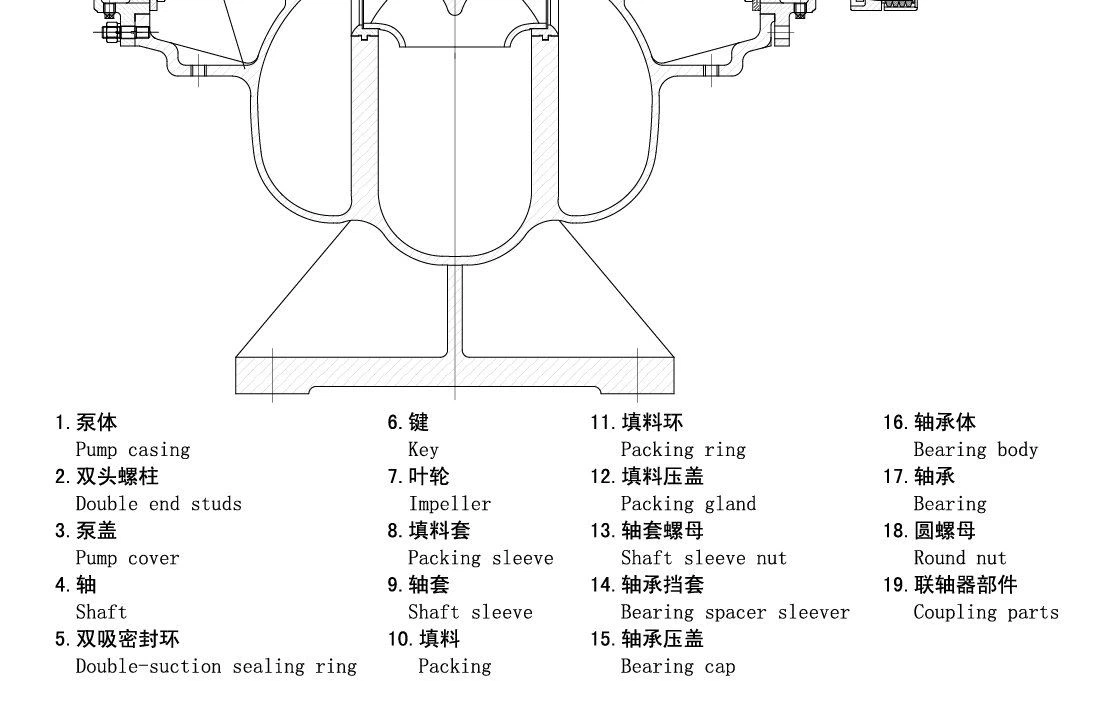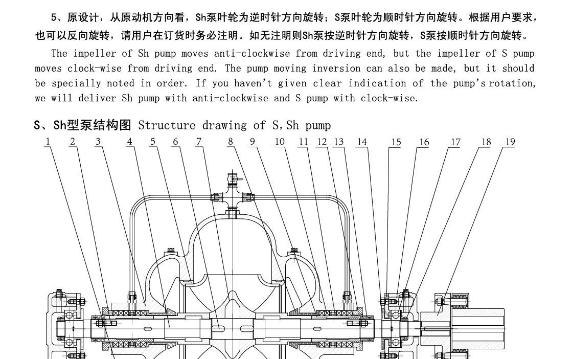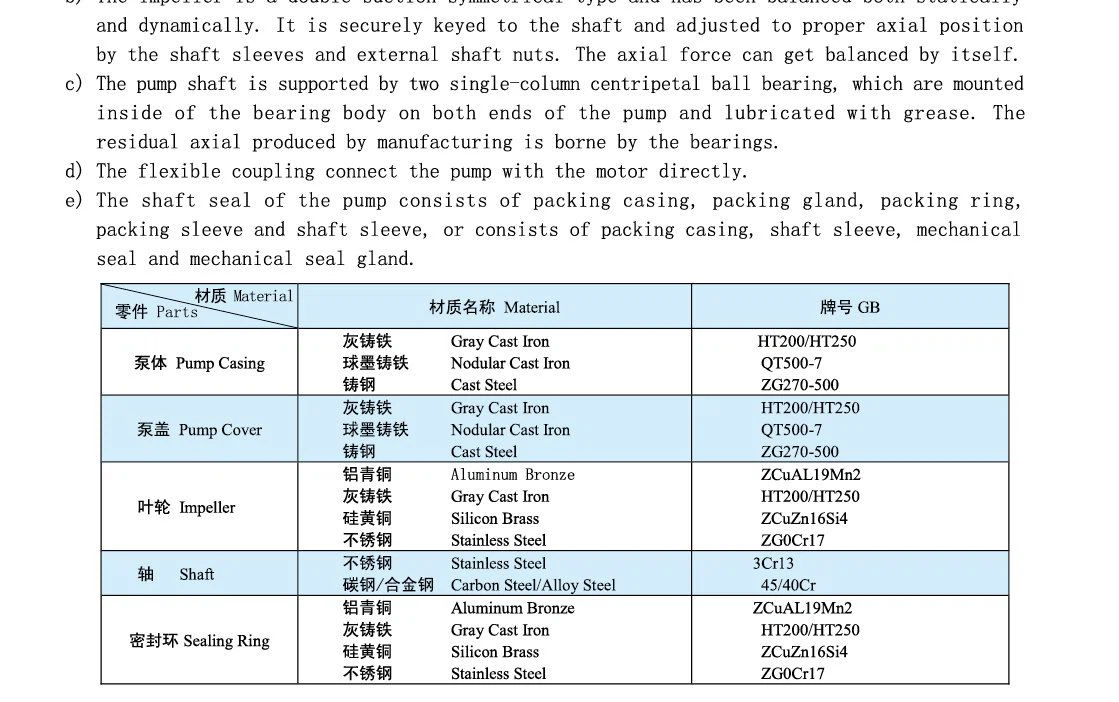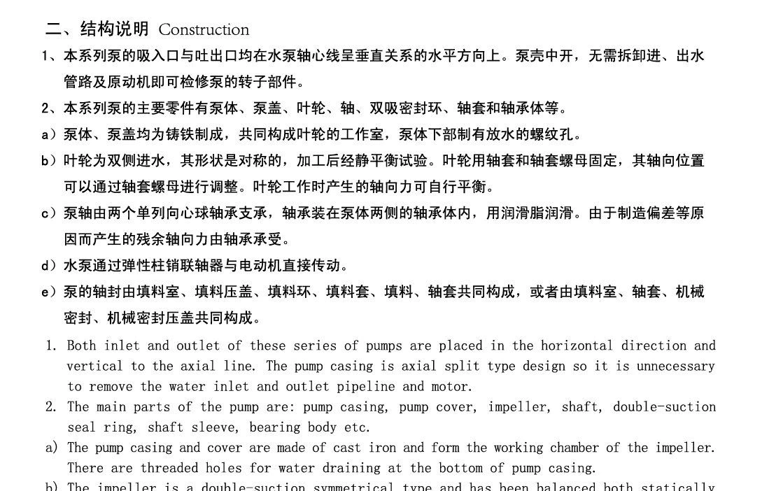 Pumpun imuportti ja ulostulo ovat molemmat pumpun akselin alapuolella, pystysuunnassa vaakasuunnassa akselin kanssa, auki pumpun kuoressa, eikä vettä, viemärilinjaa ja moottorihuonetta tarvitse purkaa (tai muita alkuperäisiä motiiveja). Pumpun kytkinsuunnasta pumppuun pumppu pyörii myötäpäivään. Vastapäivään pumppuja voidaan myös tuottaa tarpeen mukaan, mutta erikoistilauksia on tehtävä. Pumpun pääosat ovat pumpun runko, pumpun kansi, juoksupyörä, akseli, kaksinkertainen imutiivisterengas, akseliholkki, laakeri ja niin edelleen. Erilaisia materiaaleja voidaan vaihtaa eri mediojen mukaan.